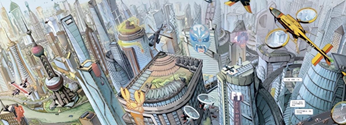 《球状闪电(上)》中的一张全景图,对中国城市的还原十分逼真,添加的科幻元素又天马行空,既承接了上文,又交代了书中的大背景,巧妙地解释了为什么要研究球状闪电和高科技武器。