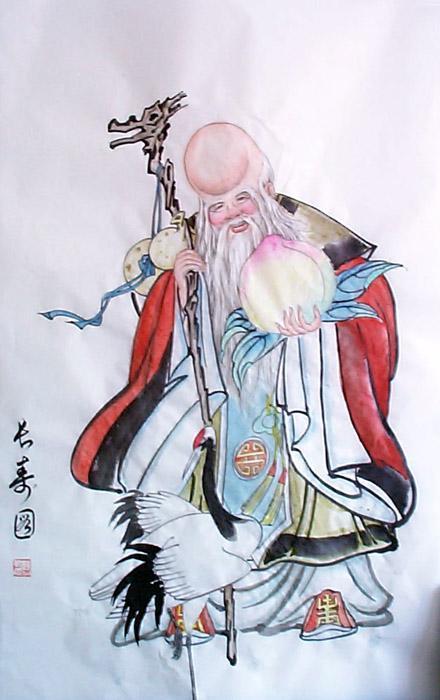 道教初以南极星为神仙,《真灵位业图》将“南极老人丹陵上真”列在太极左位。后因应民间流传,二星合而为一。寿星形象为一白发老翁,鹤发童颜,面目慈祥,所拄弯曲拐杖,必高过头顶。常被民间用作年画图案,是吉祥长寿的象征。