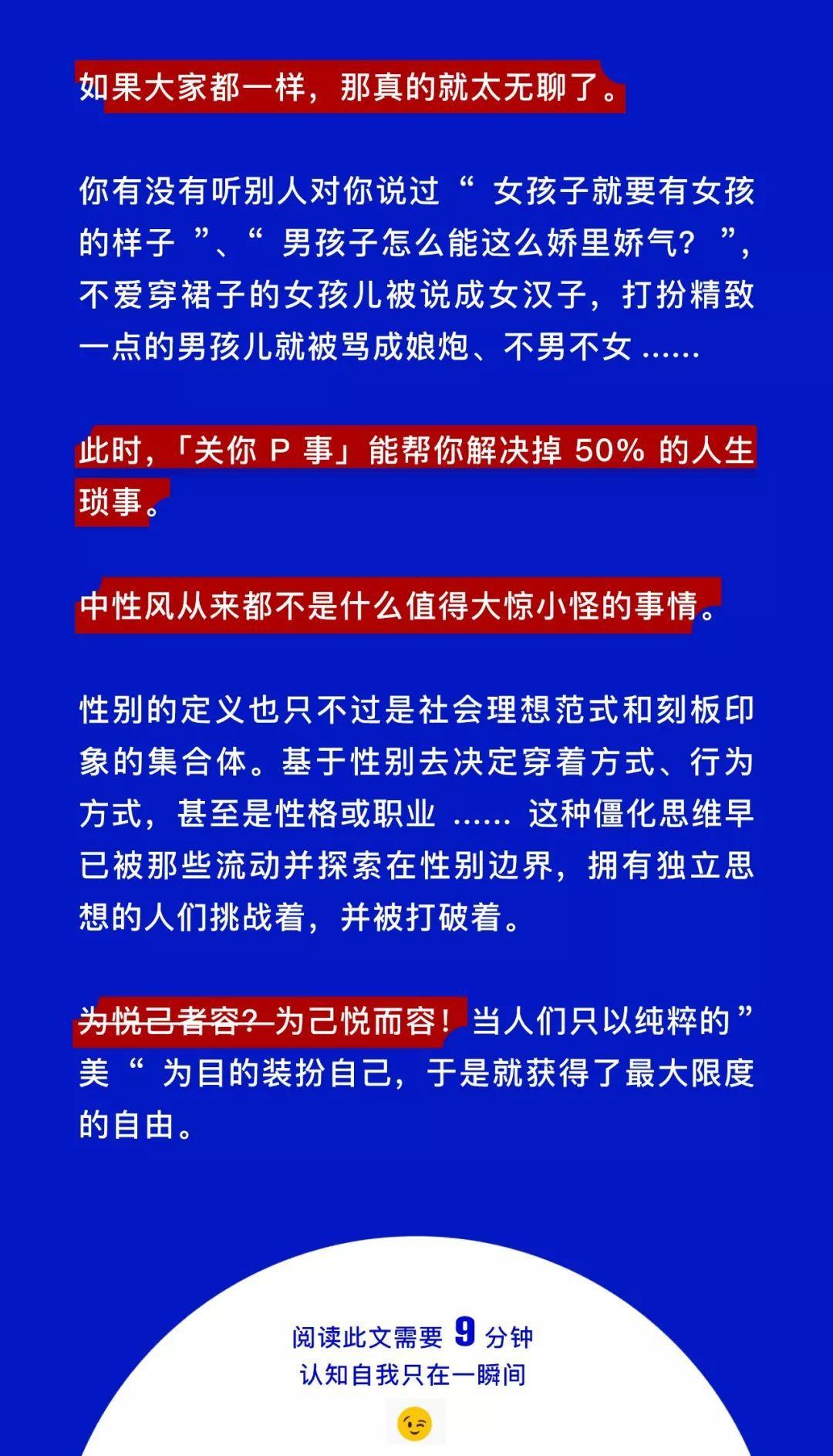 穿衣风格和性别、肤色、胖瘦都无关,但它和如何定义自我有关。就像一开始我们提到的关于无性别主义和中性风的定义,它是打破传统局限的态度,是忠于自己内心的独立精神,选择让自己觉得最舒适的状态,而不是被任何外界之力所束缚。