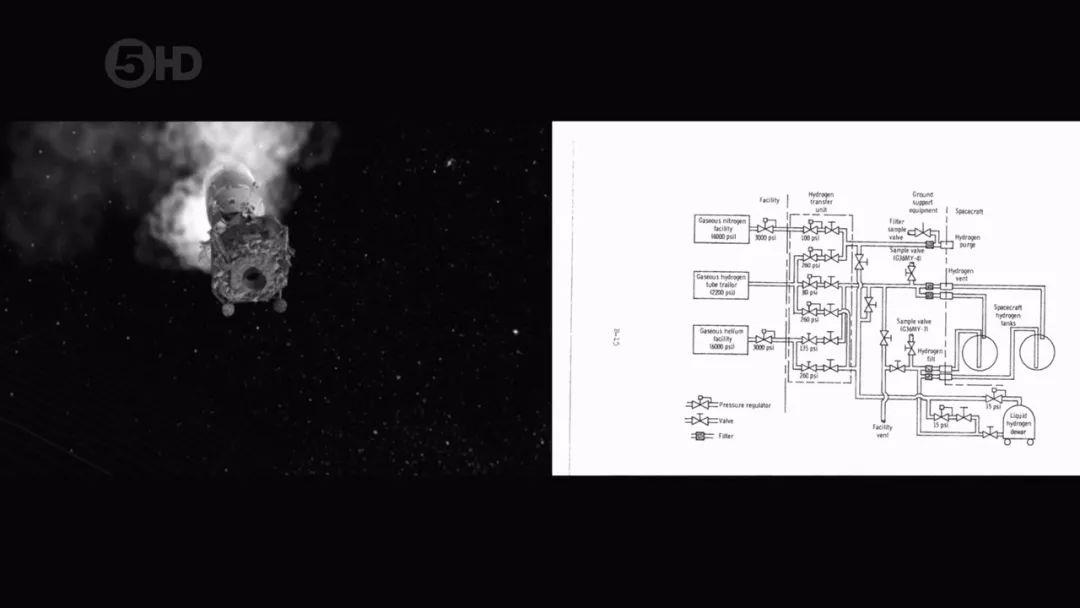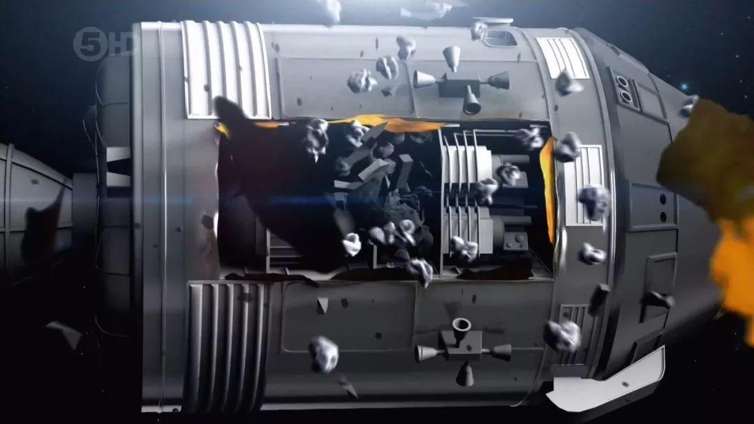 这是一次例行操作,目的是让系统保持压力,不过当他扳动开关时,爆炸发生了。从窗边看,凝固态的氧还有破损隔热层的各种碎片在飞行器周边到处都是。