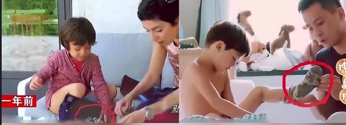一双灰色的斑纹袜子,诺一录制《花样爷爷》时就穿在脚上,一年后参加《爸爸去哪儿》,即便脚已经长出了一大半,袜子依然可以继续利用。