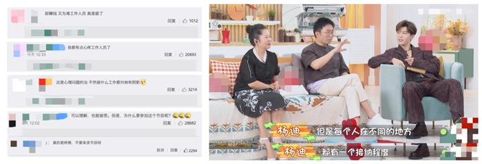 观众跟网友看到这里觉是杨子珊的洁癖严重到了需要去看看心理医生的程度了,觉得她至少需要忍耐,不能一边上节目赚钱,一方面还耍态度为难栏目组的人员,感觉她实在不该上这种节目,要上的话,就别表现得这么矫情!不过杨迪在直播间倒是替她讲了不少好话,认为每个人对一件事情,都有一种自我认知与接受的范围,超出了自己的尺度,就有可能会引发情绪上的不安、抵触与崩溃。