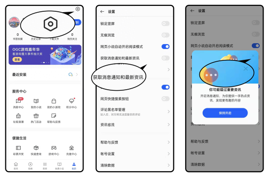 打开手机浏览器,在“设置”中找到“消息通知”,关闭资讯通知开关。