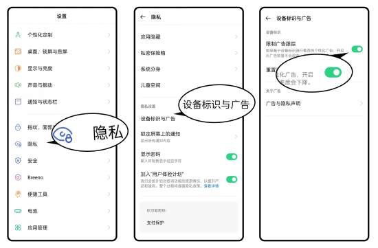 打开手机设置,找到“隐私”中的“广告”,打开限制广告跟踪功能。