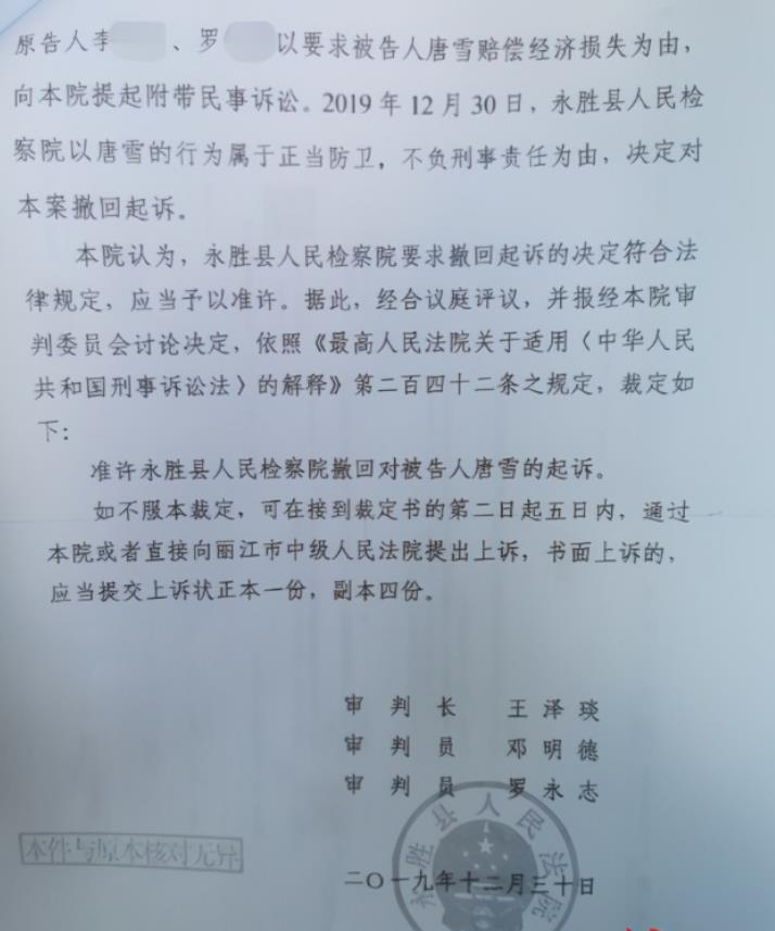 直到2019年12月30日,云南省人民检察院发布通报,认定唐雪属于正当防卫,依法不负刑事责任。同日,永胜县人民检察院撤回了对唐雪的起诉,并将其释放。