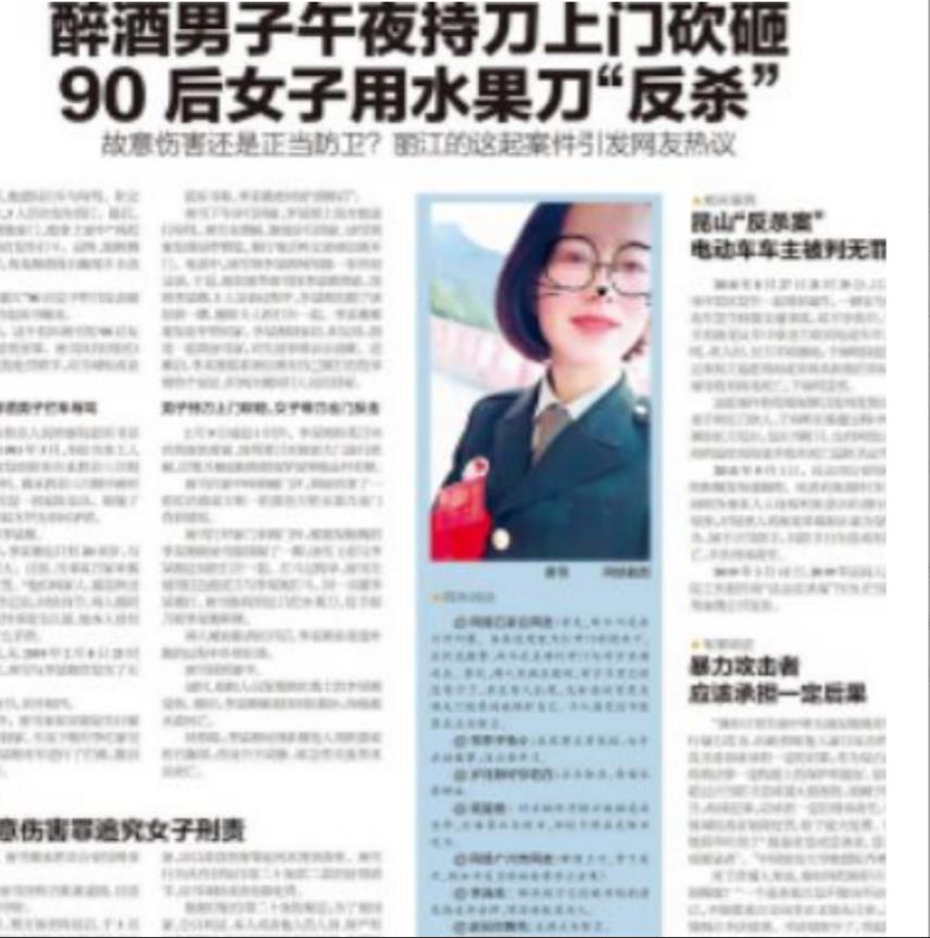 通报称,经审查认为,唐雪家人及住宅多次被醉酒男子李某湘侵犯,特别是在凌晨1时许家门被砍砸、出门后又遭李某湘脚踢拳殴,唐雪先持削皮刀反抗,后持水果刀反抗,系为保护本人和家人的人身安全而采取的制止正在进行的不法侵害的自行防卫行为,符合《中华人民共和国刑法》第二十条第一款之规定,属于正当防卫,依法不负刑事责任。