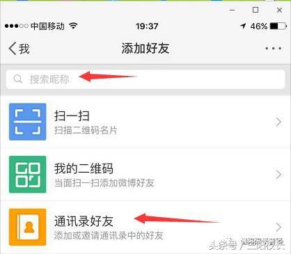 这里注意下红色箭头处的昵称和通讯录好友,很多用户会使用相同的昵称,头像甚至是账号密码注册不同的网站/APP。这点是要提示大家的。说道通讯录好友,你可以把手机号存储到你的通讯录,之后各大社交APP一般都会提示导入你的通讯录好友,比如此处的微博,这样你就可以逛一逛他的微博号内容了。另外QQ这里也说一下,虽然通过查找QQ你不能加为好友,但是看看它的腾讯微博还是可以的,有的人QQ说说记录是一键同步到QQ空间或微博的。