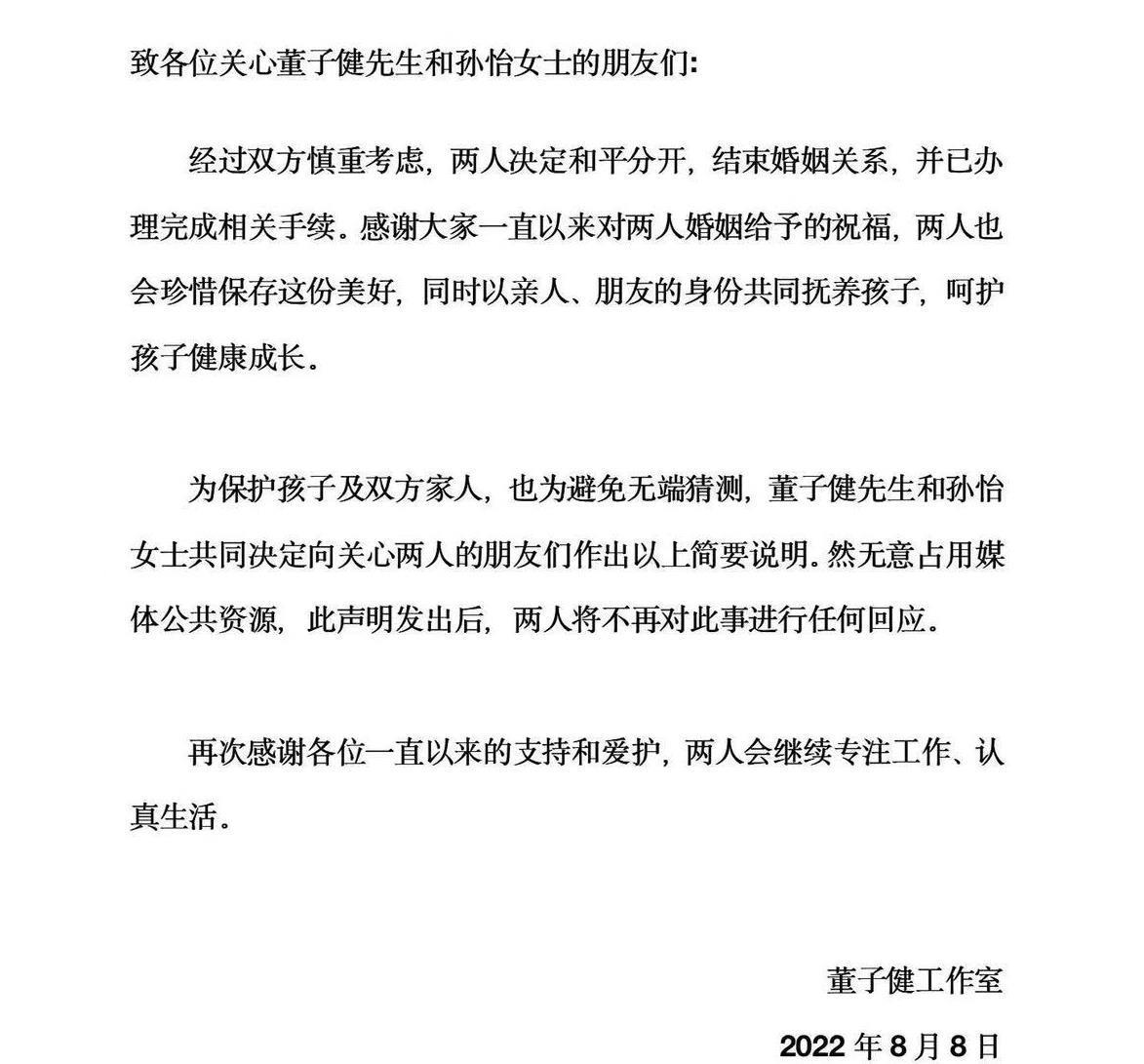 离婚的官宣发生在今天的早上十点整。董子健在社交平台上发布了一条消息:“咱都会好好好的!”并且@了孙怡的微博。这条消息引起了许多不明真相的网友的议论,大家都在猜测发生了什么事情,是否他们已经离婚。而与此同时,孙怡也在同一时间发布了一条动态:“从前祝我们,今后祝你我”,并@了董子健。这一动态引发了众多孙怡和董子健的粉丝的担忧,大家都在追问双方是否真的已经离婚,甚至搜索引擎的结果也将他们描述为“前任”。面对粉丝的疑问,两人的工作室随后发布声明,确认了两人已经决定和平分开,结束了婚姻关系。