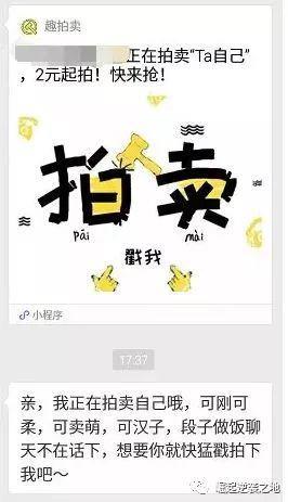 像上图,实际上拍卖的是和妹子通话一小时的机会,在小程序链接后加上简单的话术引导,让人不自觉的认为这是一个软萌妹发来的拍卖,激发男同胞们拍下的欲望。最终这个和妹子通话一小时的机会被拍到了380元。