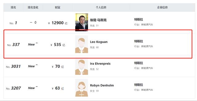 然而我们只知道特斯拉的总裁是马斯克,却忽略了其背后的“华人老板”。这位老板和马斯克一样,其身价也成功入围到了2022年全球富豪榜的榜单中,他的英文名是Leo Koguan,原名为廖凯原。