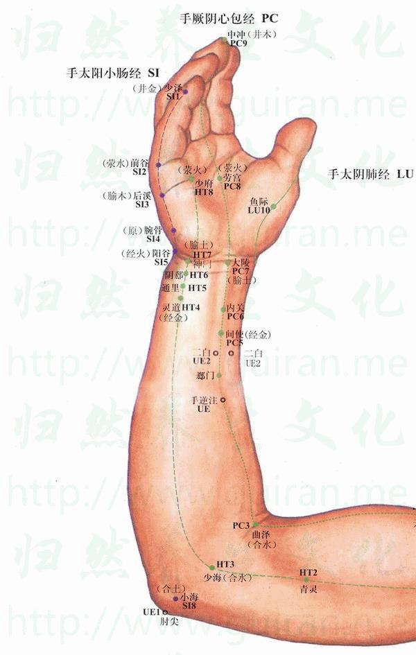 从第一个穴位开始是少泽穴,凡是在指端末梢的这些穴位都是一些井穴,“井”是源头的意思,这个穴位开始是从井里而发,这种穴位治疗热症,所以通常是用刺血 的方法效果最好。比如像少泽穴,我咽喉痛,发烧了,牙肿了,用三棱针点刺一点少泽穴出一滴血,这些问题就可以当时缓解,但是来讲,这些穴位不适合按摩,按 摩的效果不是很明显。