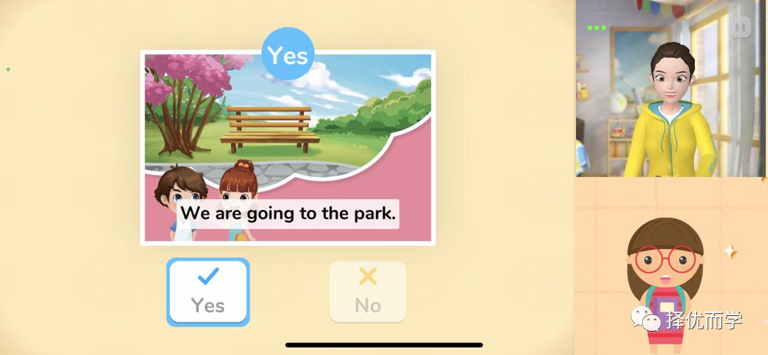 其次,听句子判断图片是否正确。3D模拟老师会读出句子,让孩子选择所听到的句子与图片是否对应。