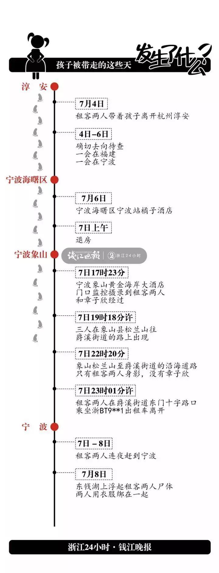 经调查,被带走孩子名叫章子欣,女,9周岁,淳安县千岛湖镇青溪村人。7月4日早上6点30分,家中租客梁某华、谢某芳谎称带孩子赴上海喝喜酒,将章子欣从家中带走。7月7日未按约定带回孩子,之后失去联络。7月8日凌晨,梁某华、谢某芳在宁波某地自杀身亡,女孩至今下落不明。目前案件正在进一步调查之中。