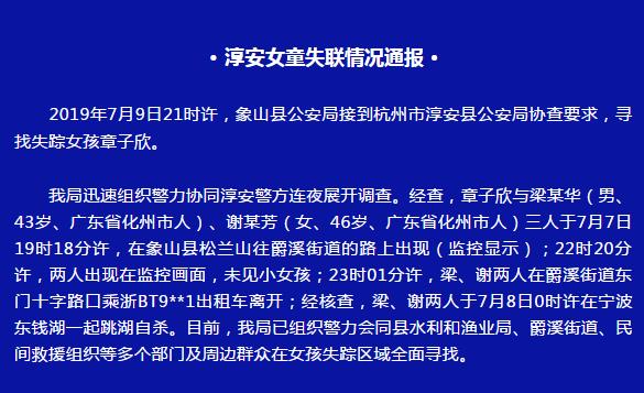 通报称,2019年7月9日21时许,象山县公安局接到杭州市淳安县公安局协查要求,寻找失踪女孩章子欣。经象山警方协同淳安警方连夜调查,章子欣与梁某华(男、43岁、广东省化州市人)、谢某芳(女、46岁、广东省化州市人)三人于7月7日19时18分许,在象山县松兰山往爵溪街道的路上出现(监控显示);22时20分许,两人出现在监控画面,未见小女孩;23时许,梁、谢两人在爵溪街道东门十字路口乘浙BT9**1出租车离开;经核查,梁、谢两人于7月8日零时许在宁波东钱湖一起跳湖自杀。