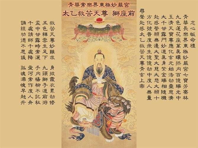 其身份类似佛教中南海观世音菩萨,大慈大悲,救苦救难并配合玉帝统御万类。地罗神,慧剑出鞘斩妖精,一切灾难化为尘,寻声救苦解救罗网苦辛,太乙救苦天尊救苦救难度众生。” 太一寻声救苦天尊主炼仙魄”和“太一救苦天尊随形赴感,寻声救苦天尊应念垂慈。”道经还称东极青玄上帝即化太乙救苦天尊,又应化十方,而为十方救苦天尊。