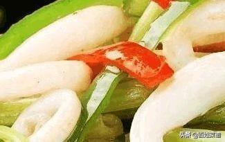 8用油起锅,倒入青红椒丝、鱿鱼圈炒匀。