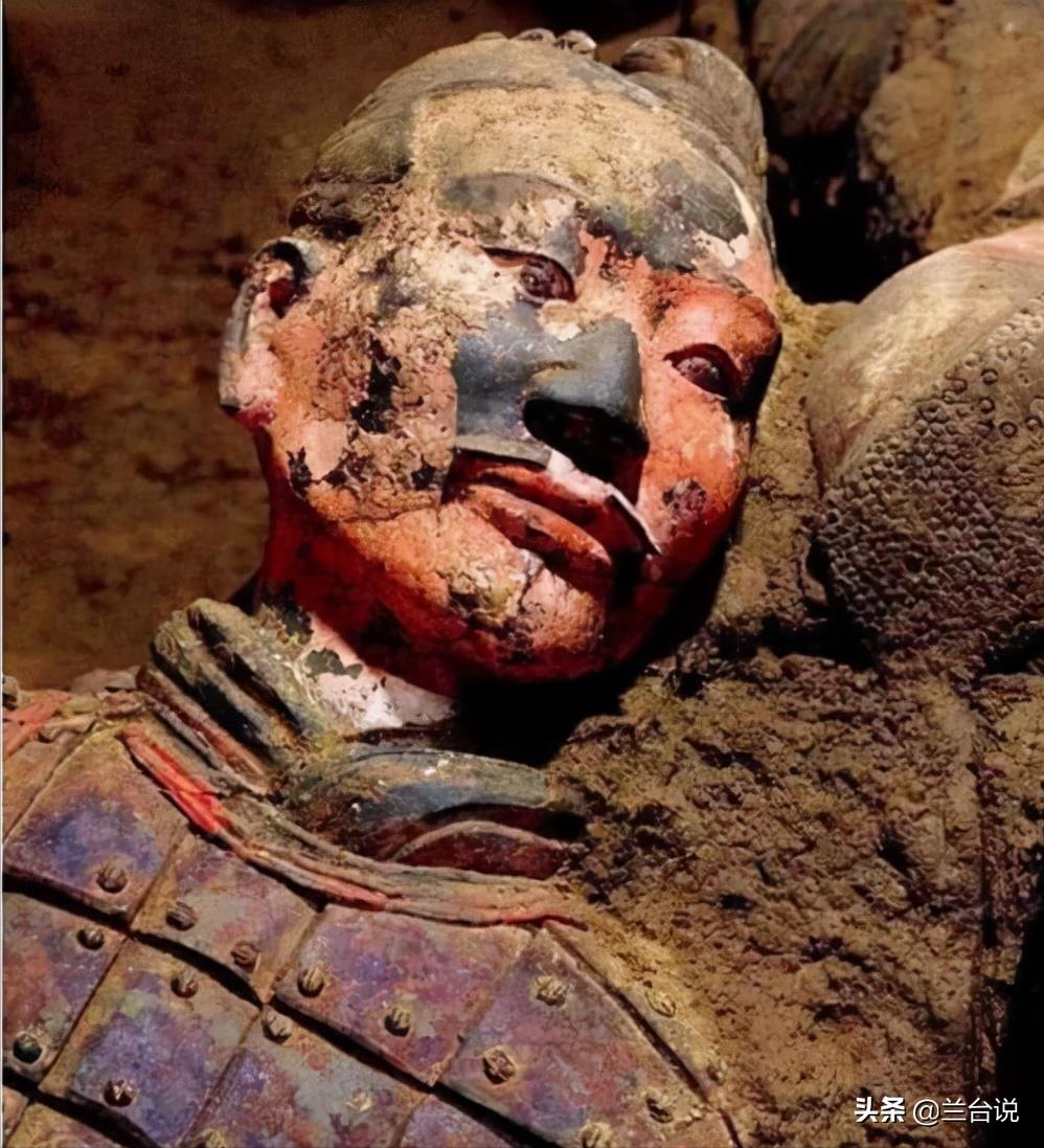 然而,秦俑刚出土时保留着鲜艳的彩绘,遇到空气后被氧气,颜色在几秒钟内瞬间消尽,化作白灰,俑体表层翘卷脱落。