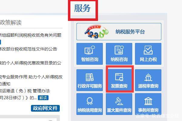 2、在国家税务总局官网内找到“服务”下面的“发票查询”,并点击进入。