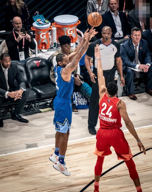 首先来看伦纳德,今天和詹姆斯一起打球之后,伦纳德一开场就接连命中两记三分球,帮助詹姆斯战队取得领先优势。球迷都知道伦纳德的杀手锏是中距离跳投和背身单打,但在全明星的舞台上却不太适合这种实用性超强的进攻方式,三分球和空接扣篮才是。