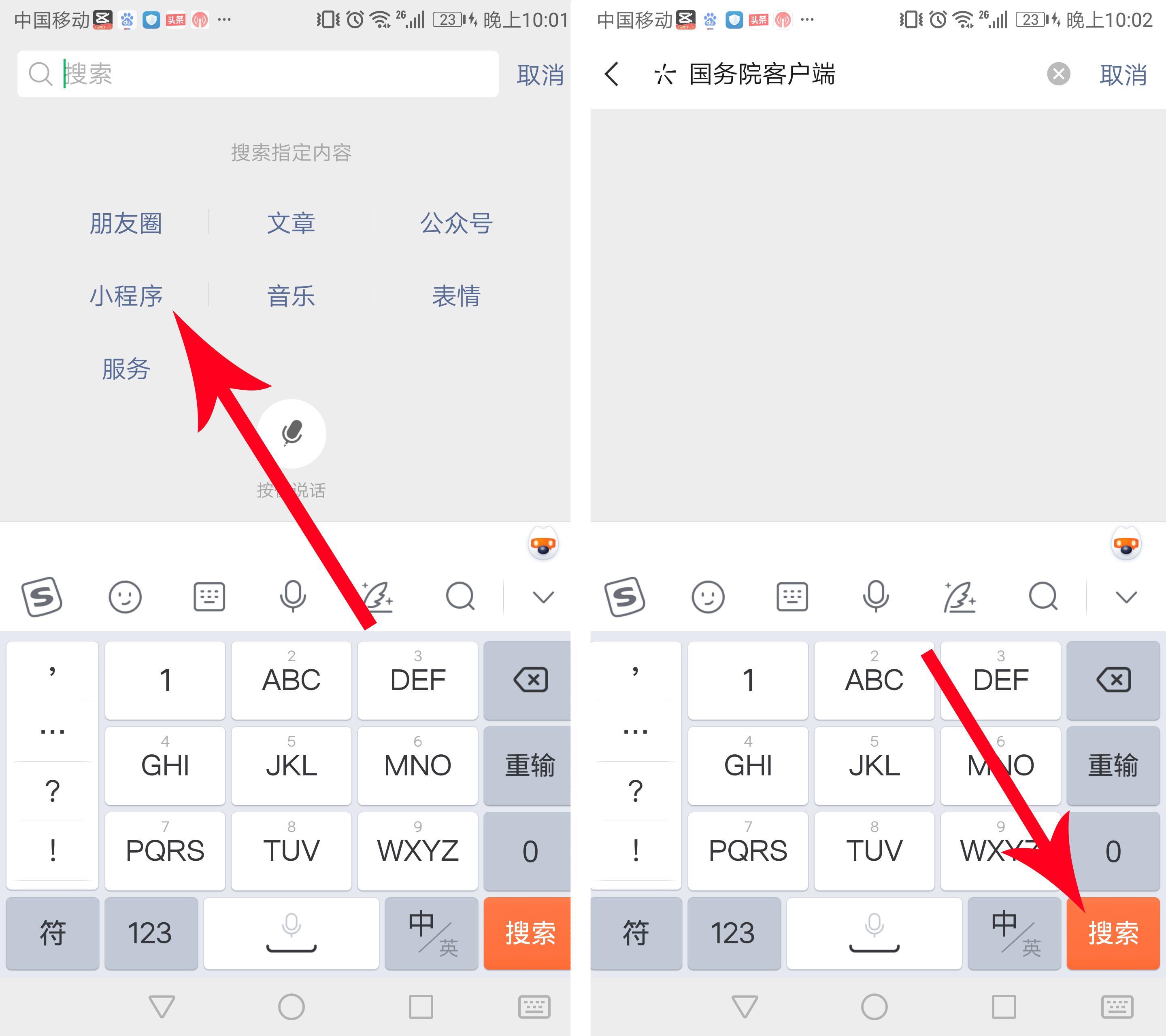 2、打开微信搜索界面点击“小程序”,然后搜索“国务院客户端”。