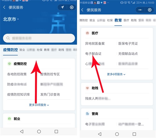 4、打开便民服务界面,向上滑动至医疗板块,然后点击“电子献血证”。