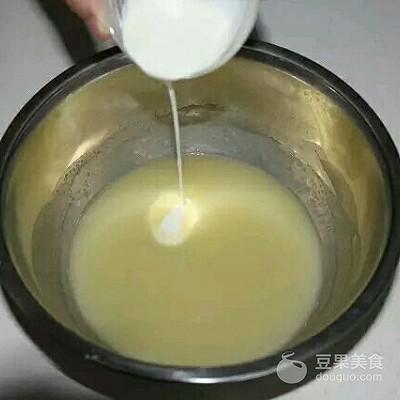 4、63克的淡奶油和62克的细砂糖一起煮开化糖