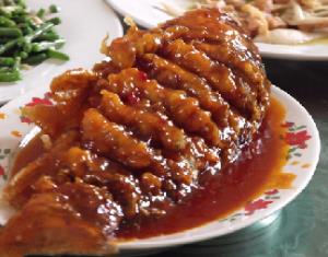 菜品特点:色泽深红,外脆里嫩,香味扑鼻,酸甜可口。