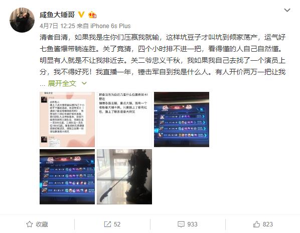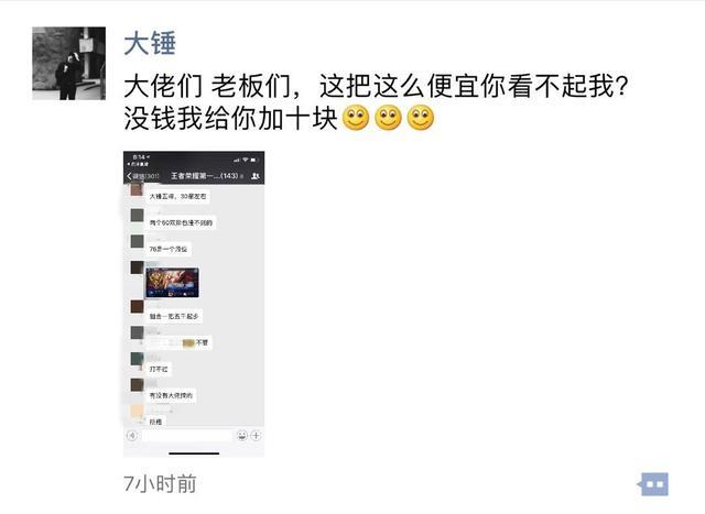 并且大锤哥在本赛季成功冲击王者之后,就一直在打娱乐局.虽然大锤哥的实力不算是非常顶尖,但是大锤哥拥有国服第一关羽这个称号,实力也不容小觑.所以在打娱乐局的时候,大锤哥虽然不能保证把把获胜,但是胜率还是非常高的,更笨不需要利用演员来帮助自己.并且大锤哥在看到演员狙击自己的价钱之后,还询问到要不要加钱给他们.
