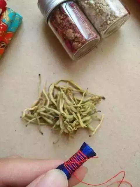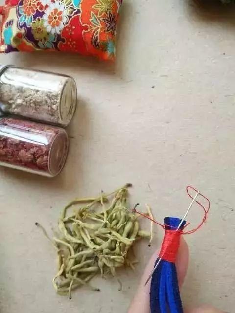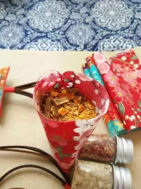 3.装香料。常见有艾草,金银花,薰衣草,陈皮,丁香,白芷,石菖蒲,藿香,薄荷,玫瑰……一般在药店就可以买到。(装时在最底下先放一层艾草或薰衣草等粗颗粒香料,最后在最上一层同理)