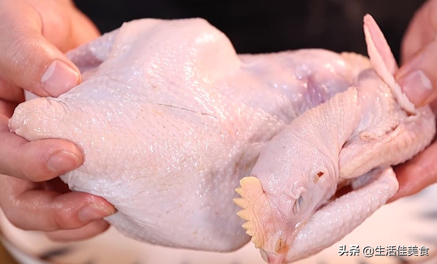 第二步:接着,先把一只鸡的翅膀从嘴巴地穿出来,另外一只翅膀绕脖子缠起来,再把两只脚塞进鸡肚子里,这样鸡身就不容易散开了,而且美观程度不亚于专业绑鸡户,嫌麻烦的,用线绑也一样的效果。