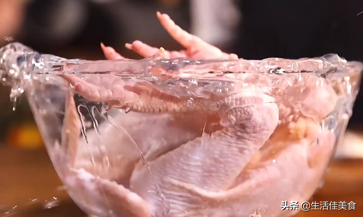 第一步:准备一斤左右的三黄鸡一只,食材在各大超市均有出售,网上采购冷冻的也可以,买来解冻用温水泡一下,不仅能去腥,还能让鸡皮的颜色更好看。