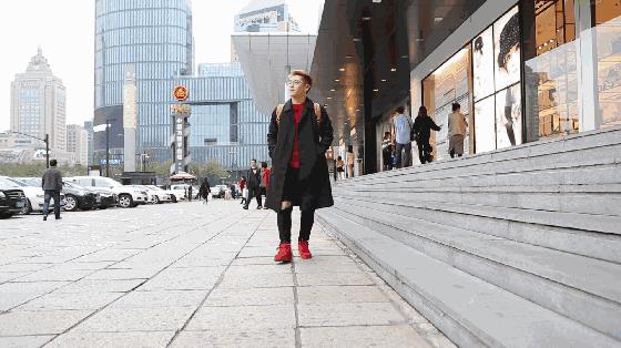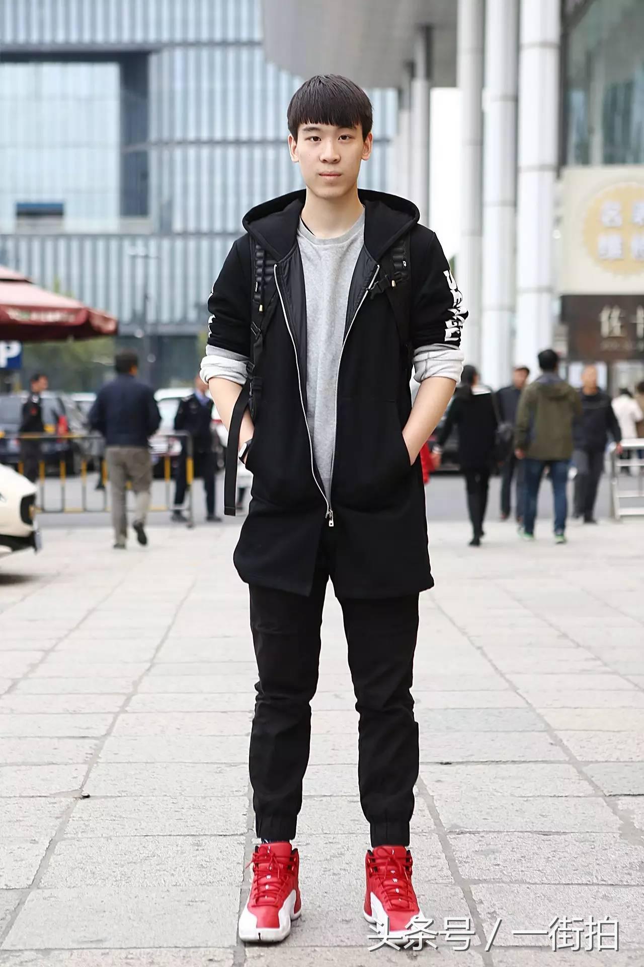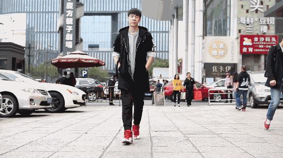 整身黑色的搭配如何穿出彩,就需要在款式和单品上下功夫了,选择一件帅气的帽衫,用红色球鞋作为亮点,是不错的选择
