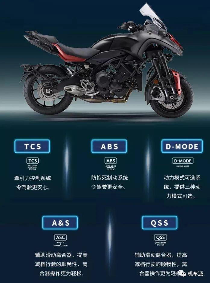 2018年上市搭载MT-09引擎的Niken则是首次进入中国,水冷直列三缸排量847cc,最大马力约115匹,采用了钢管式车架和四根倒立前叉组成的前悬挂系统、Yamaha LMW可倾侧双前轮独特形式最大倾角45度,2020款加入了新的红色配色,鞍座采用了异色的缝线,电控方面配备了牵引力控制(TCS)、ABS、三种动力模式(D-MODE)、辅助滑动离合(A&C QSS)。