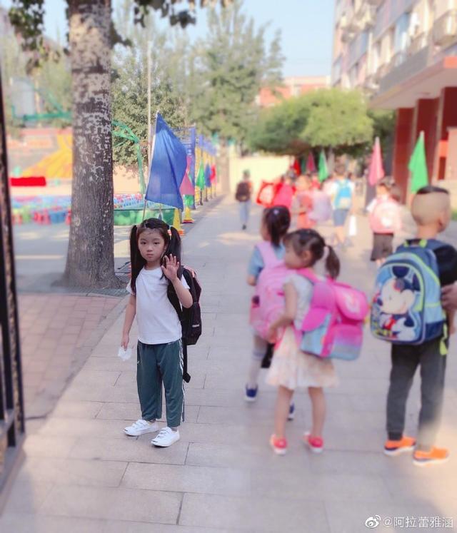 照片中阿拉蕾扎扎着两个长辫子,干净的白色短袖搭配一套运动收口裤,十分有模有样,不过背后的书包好像大了一些,显然在路上拍照的阿拉蕾还十分开心,但是走进学校与家人挥手离别的时候看得出还是有一点点不舍的。