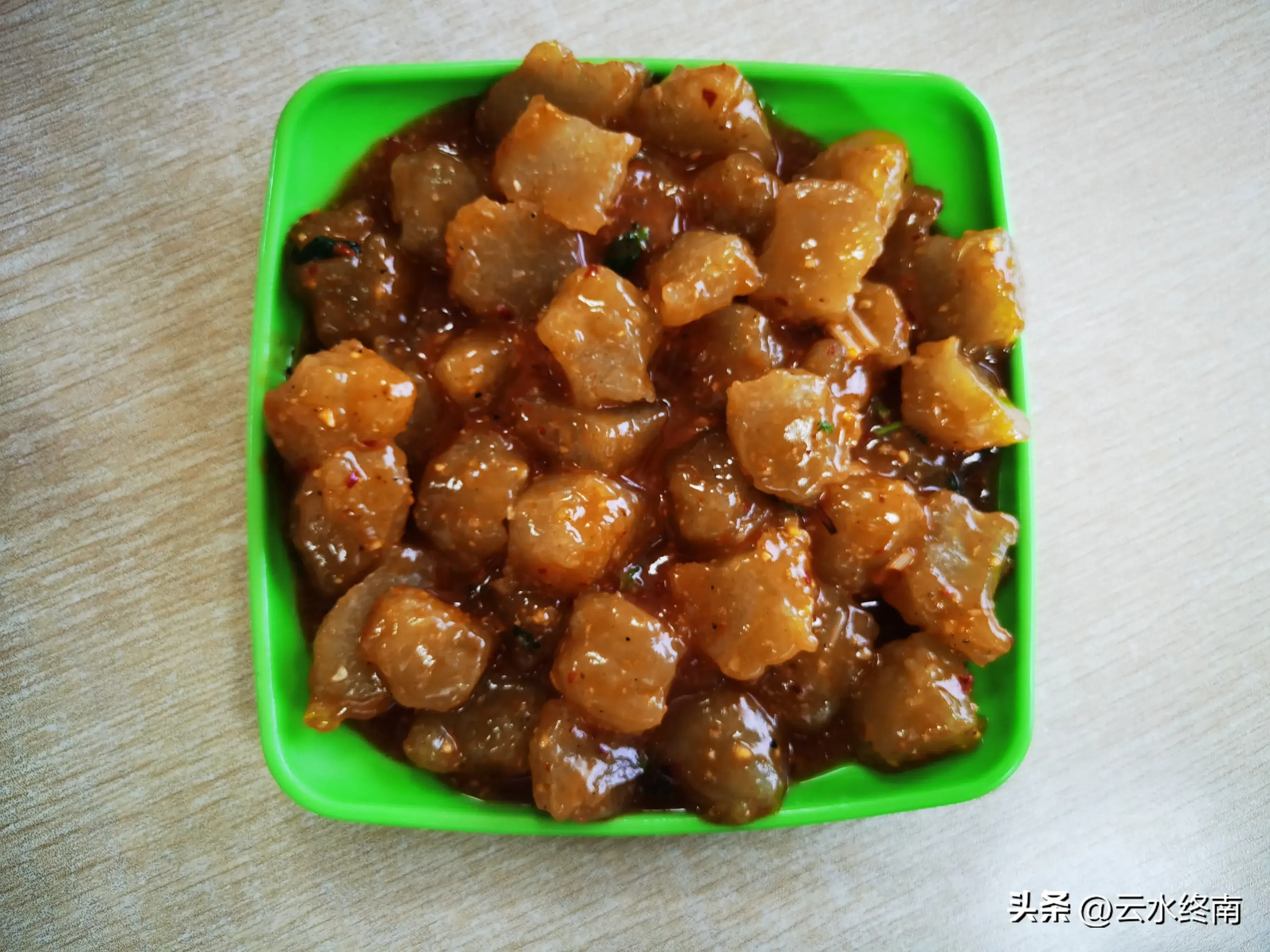 一会儿端上来一盘块状粘稠物,真猜不出来什么做的,夹起来送到嘴里,鲜香,很有咀嚼感,有些嚼头。