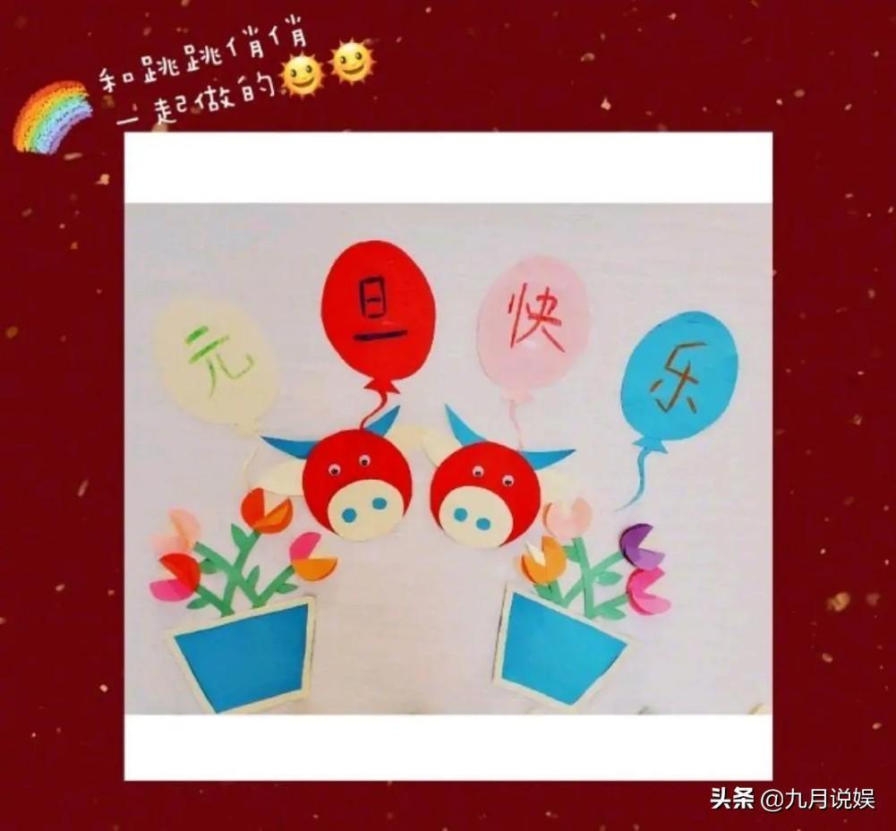 与此同时,还秀出了一张卡片,疑似是和跳跳俏俏一起制作的手工作品。因为今年是牛年,所以小可爱们制作的是两个非常可爱的小牛。