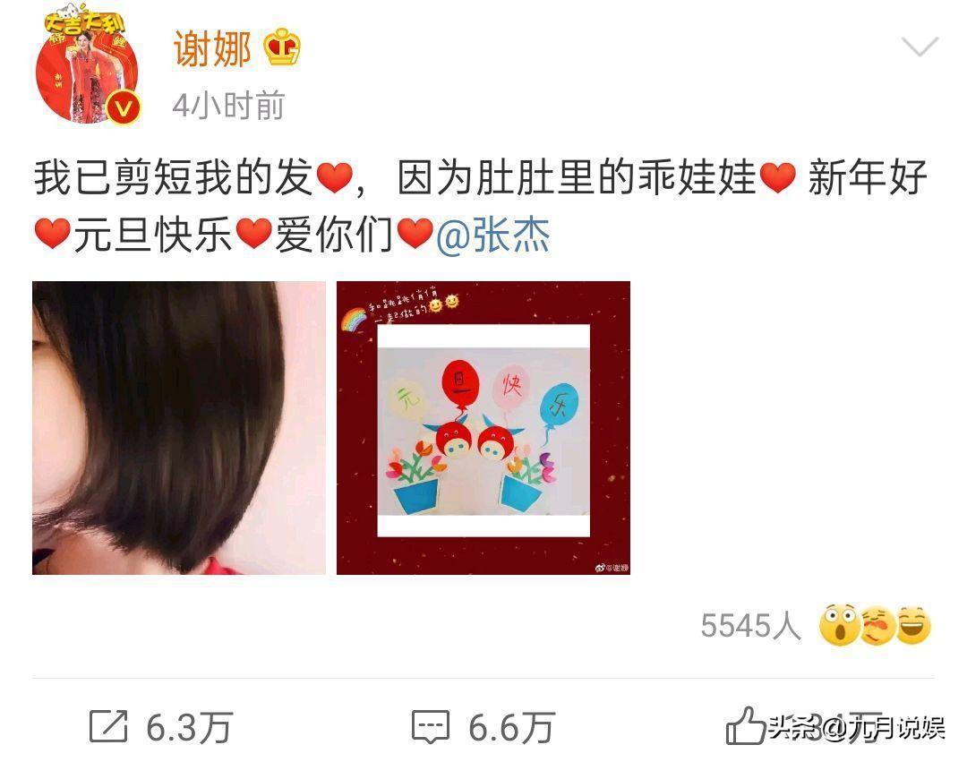 谢娜深夜发微博:“我已剪短我的发,因为肚肚里的乖娃娃”。