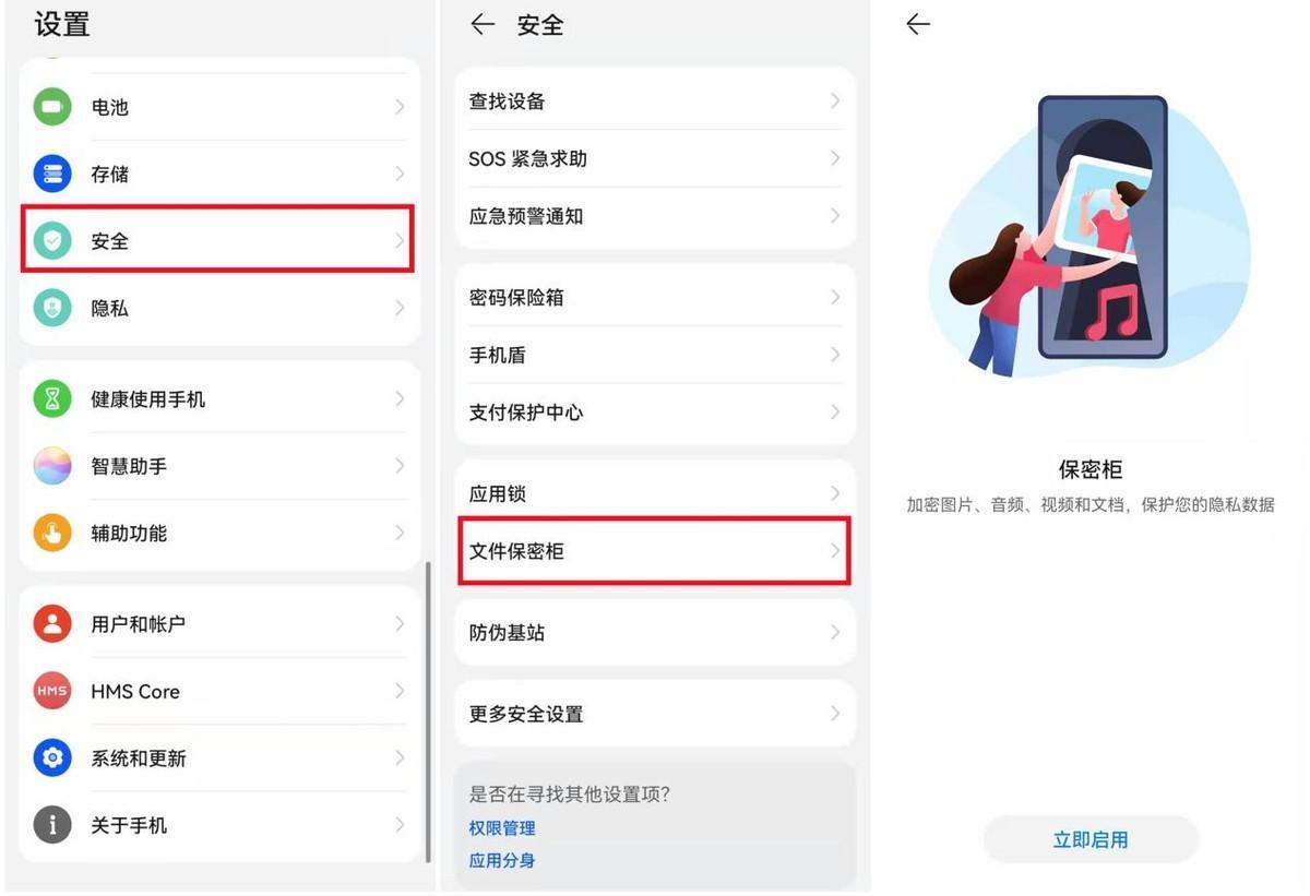 操作方法:打开【设置】,点击【安全】找到【文件保密柜】开启它即可。