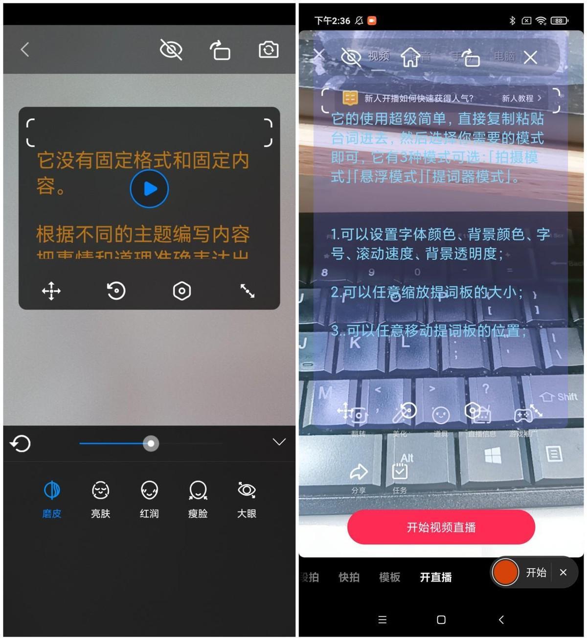 各种磨皮、瘦脸、大眼美颜功能,还有悬浮窗口可以边看台词边拍视频,就不怕看着镜头忘词了。