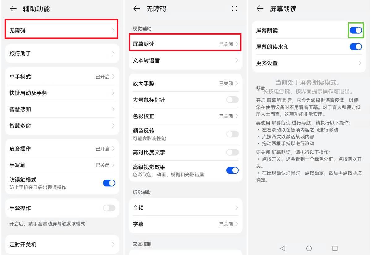 华为手机上还有一个【屏幕朗读】功能,主要是用来帮助视力不好、有色盲的人准备的。开启这个功能后,可以将文字转成语音,朗读屏幕内容。