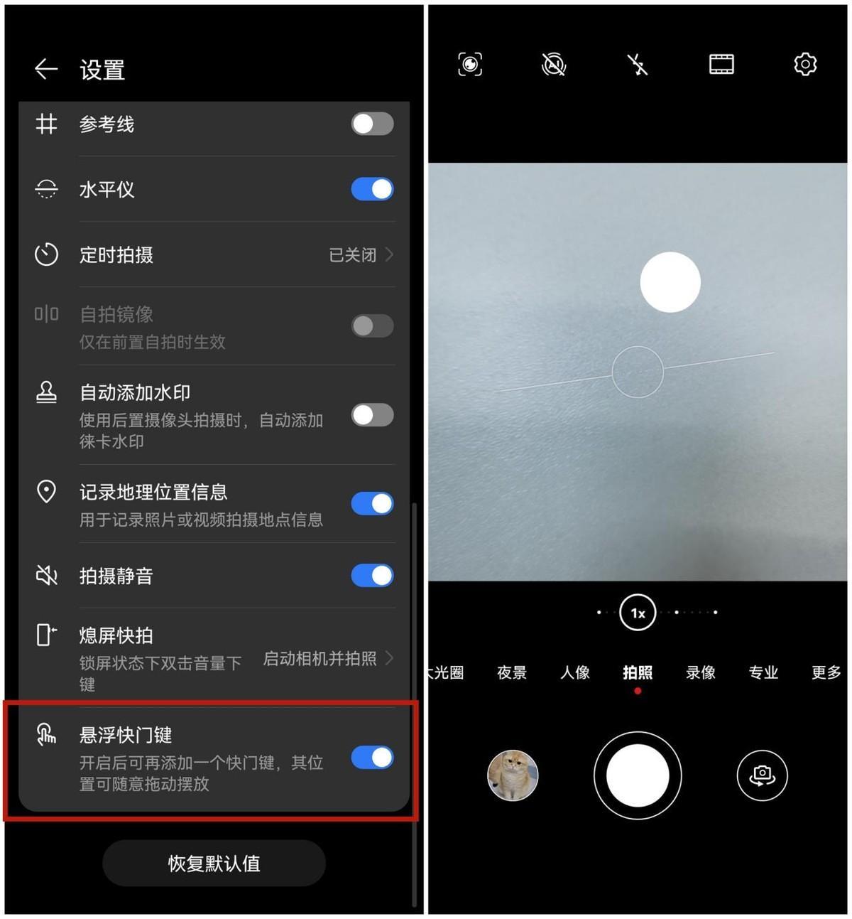 开启后,拍照页面就会生成一个白色的悬浮球,你可以把它移动到任意一个地方,点击就能直接拍照,多方便啊!
