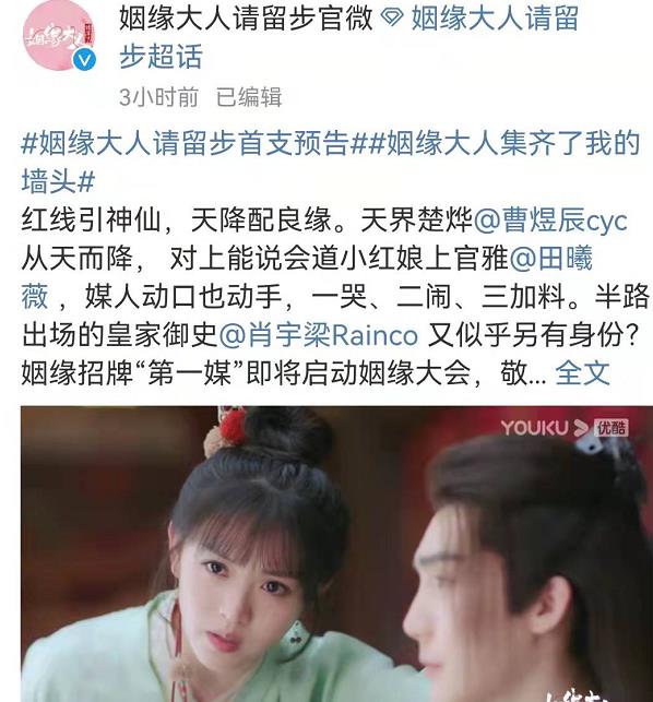《姻缘大人请留步》这部剧讲述了天神柏衍(曹煜晨饰演)因意外扰乱人间姻缘被贬下凡历劫,从天而降撞上了媒馆老板娘上官雅(田曦薇饰演),阴差阳错变成老板夫“楚烨”,两人就此携手牵红线坠爱河,开启一段拯救姻缘乱象的仙凡之恋。