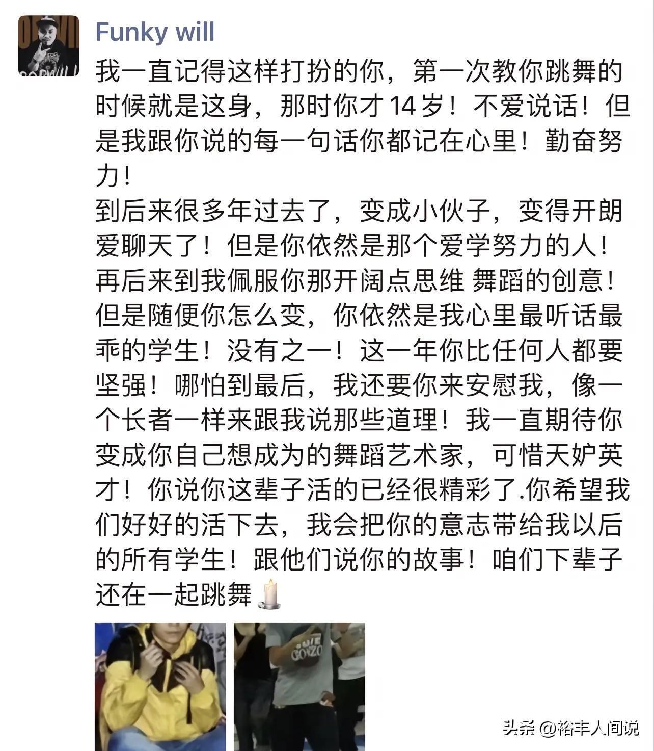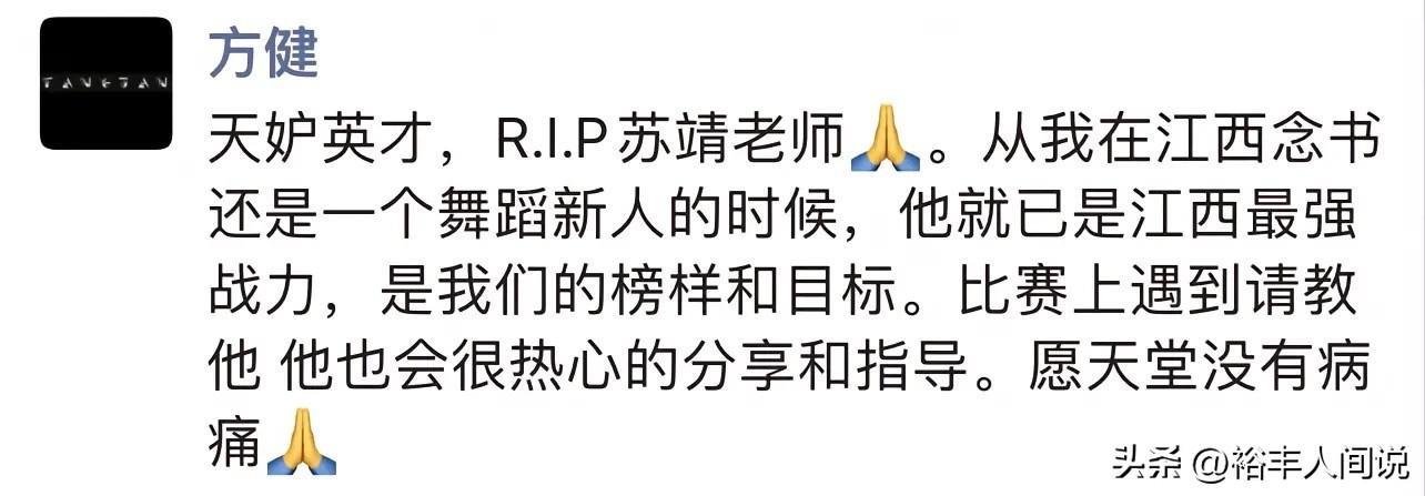 一位悼念的好友这样说道:从我在江西念书还是一个舞蹈新人的时候,他就已是江西最强战力,是我们的榜样和目标,比赛上遇到请教他,他也会很热心的分享和指导……