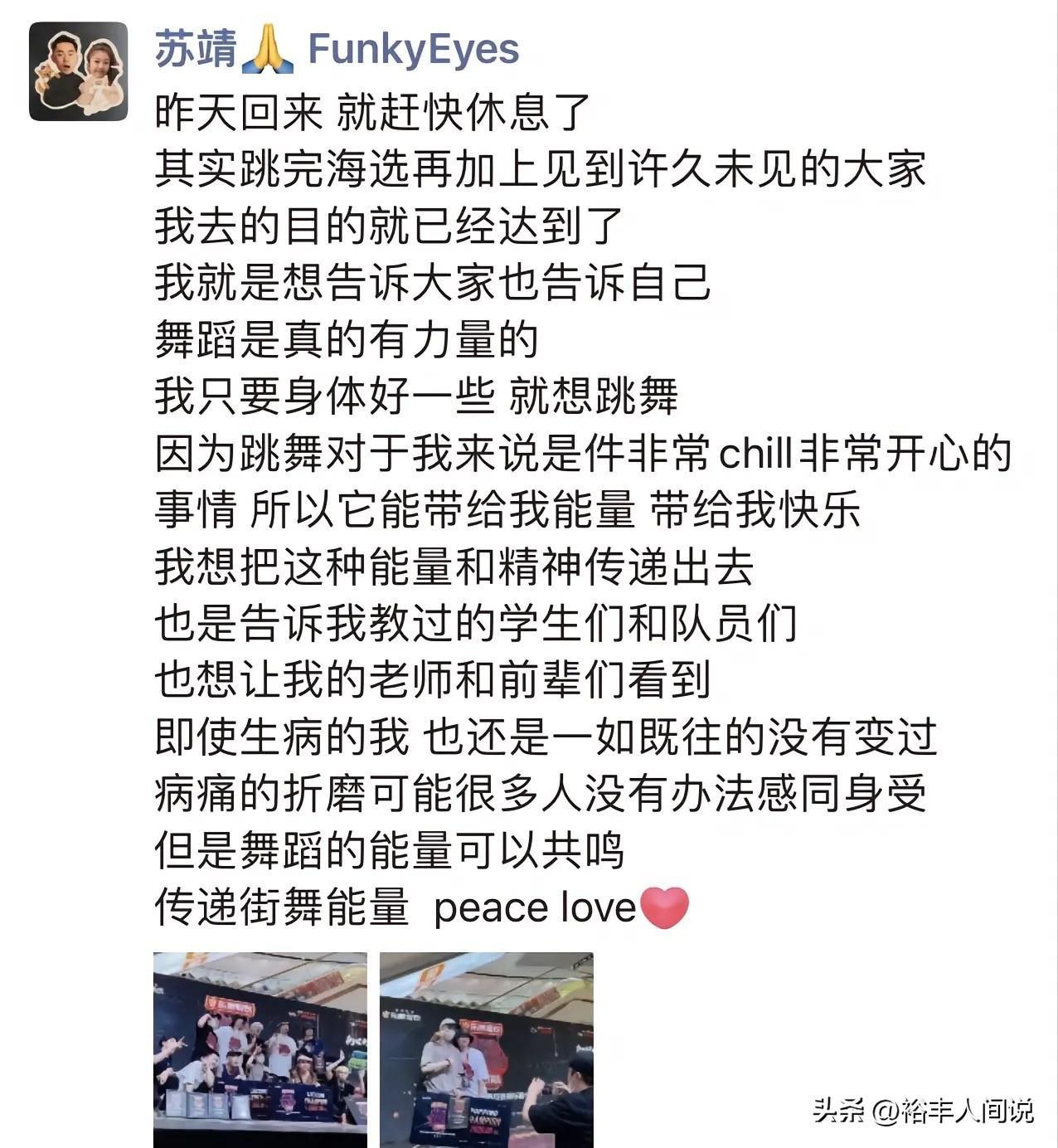 去年七月份,苏靖分享了一则乘火车外出的画面。留言处,他的学生表示:苏老师加油,等你回来。一个月后,他再次发文感慨:真的非常非常非常想跳舞,并添加了“生病”这一标签,想来那个时候的他就已经病得很严重,要不然也不会有这样一番感慨。