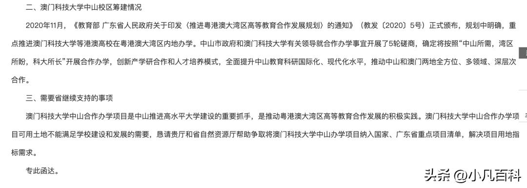 2021年4月,中山市人民政府就曾因澳门科技大学中山合作办学项目可用土地不能满足学校建设和发展的需要,向广东省教育厅去函,恳请其与省自然资源厅帮助争取将澳门科技大学中山办学项目纳入国家、广东省重点项目清单,解决项目用地指标需求。