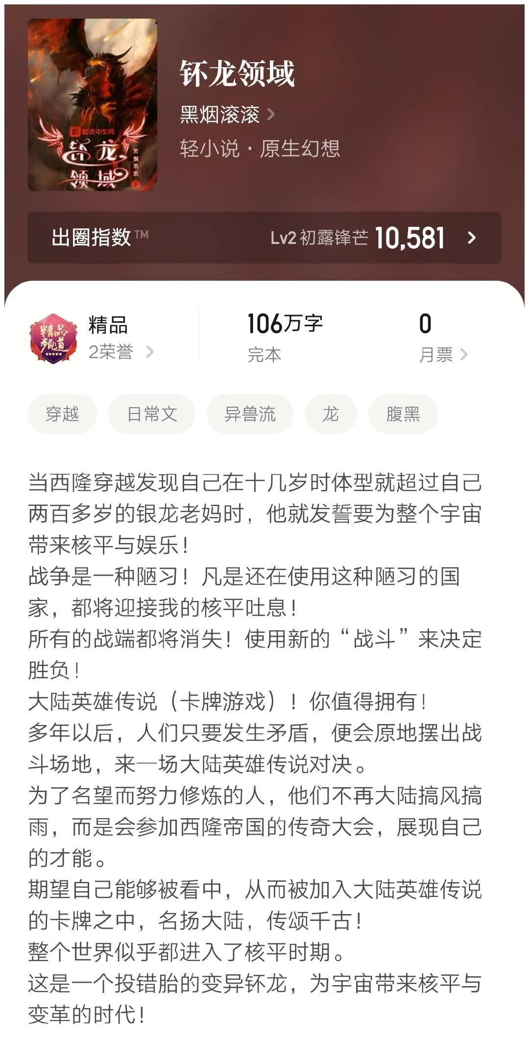 这也是一本连载中小说,主角穿越异界,成为幼龙的变身文小说。