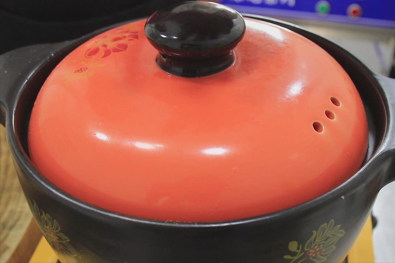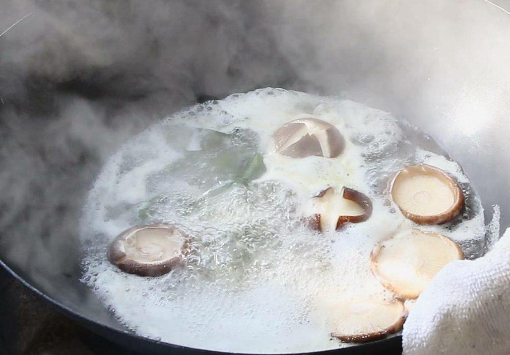 大火把水烧开,倒入香菇海带结和切好的豆腐。保持开大火,煮出豆腐中的杂质,用勺子打去浮沫。然后把锅中的原料和汤汁倒入砂锅中,盖上锅盖,保持开小火慢炖15分钟。