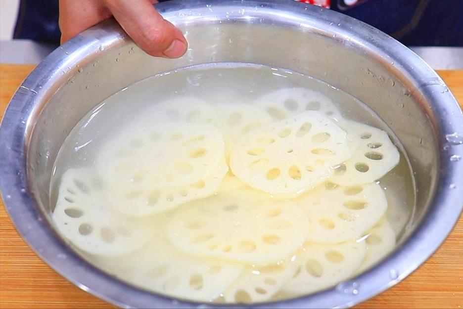 1.首先,我们准备一节莲藕,把外皮削干净、切成均匀薄片,切好以后放入清水中,淋入一些白醋浸泡一会,防止氧化变色。
