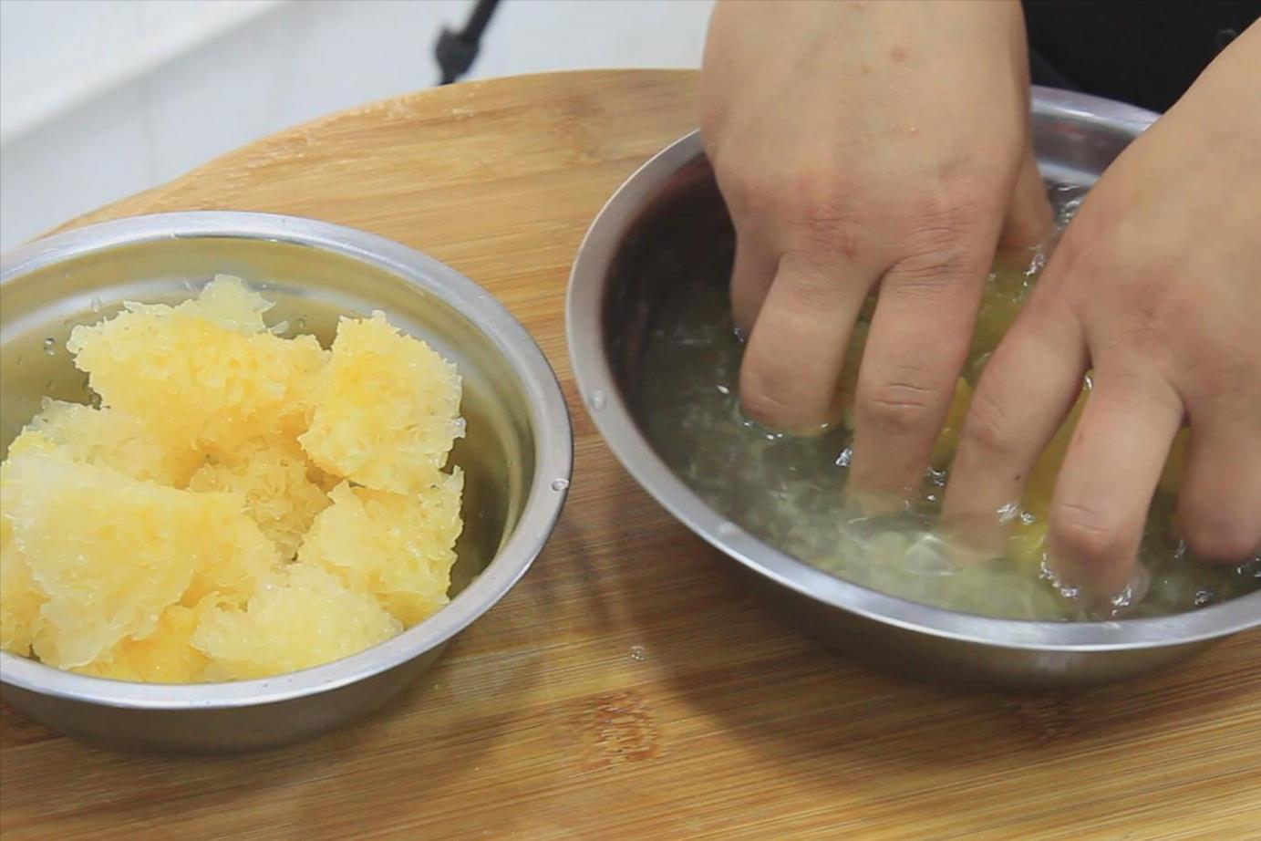 1.干银耳20克,放在盆中用清水泡发。泡发银耳要用凉水泡发,泡3个小时。泡发好的银耳,摘净根部黄色的杂质,用手撕成小块,撕的边缘不规则,更容易入味。再泡一小把枸杞。