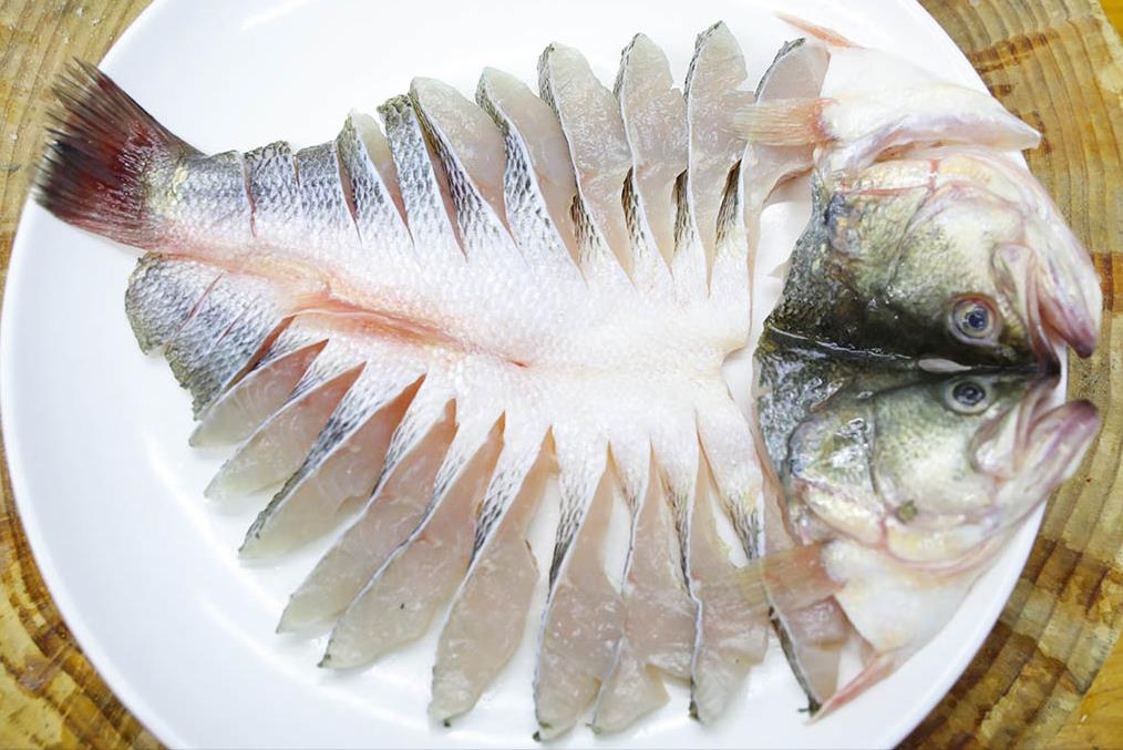1.准备一条鲈鱼去除鱼鳞、去除内脏,清洗干净。然后把鱼身冲洗干净,改一下刀。先把鱼头切下来,沿着脊骨把鱼肉片开,剔除中间的脊骨。